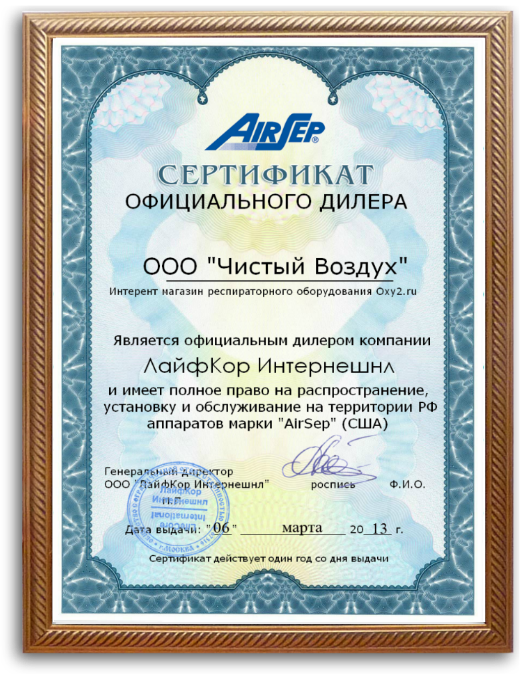 Сертификат подтверждающий, что наша компания является официальным дилером по распространению кислородных концентраторов торговой марки AirSep.