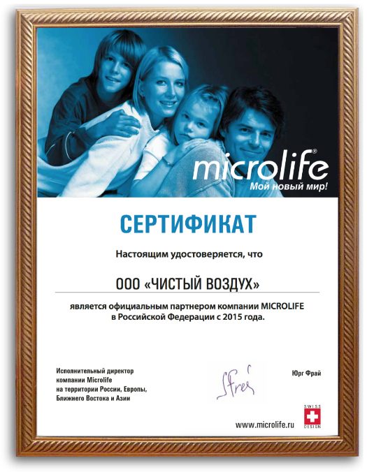 Сертификат подтверждающей, что наша компания является официальным партнером по распространению продукции торговой марки Microlife