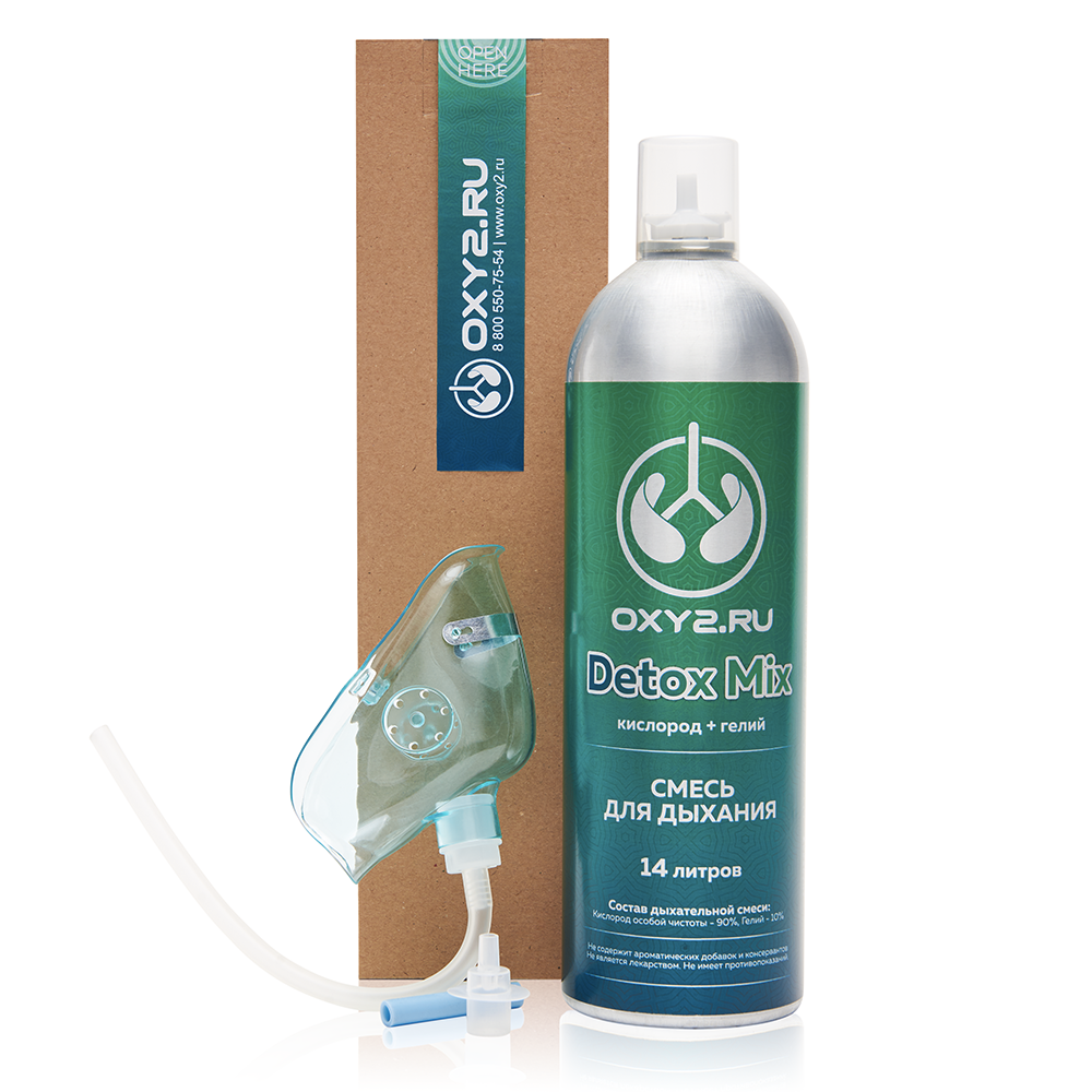 Detox Mix — кислород 90% и гелий 10%. Дыхательная смесь обладает особой эффективностью при восстановлении после перенесенной пневмонии и других заболеваний. Выводит токсины, отравляющие вещества, очищает легкие и кровь, поэтому является средством для детоксикации организма при отравлениях (угарным газом, алкоголем, сигаретами и проч.). Кислородный баллончик поставляется с мягкой маской.