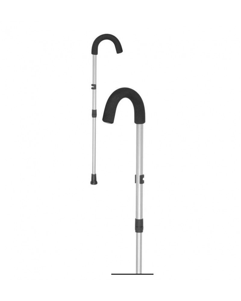 Рукоятка трости изготовлена из губчатой резины, имеет изогнутую форму, удобно сидит в руке. Предназначена для пользователей, имеющих деформации кистевого отдела. Также хорошо подходит для хвата двумя руками, чтобы облегчить передвижение при подъеме. Трость настраивается по высоте, что позволяет с комфортом использовать ее пользователям разного роста. Обладает легким весом за счет конструкции из облегченного алюминия.