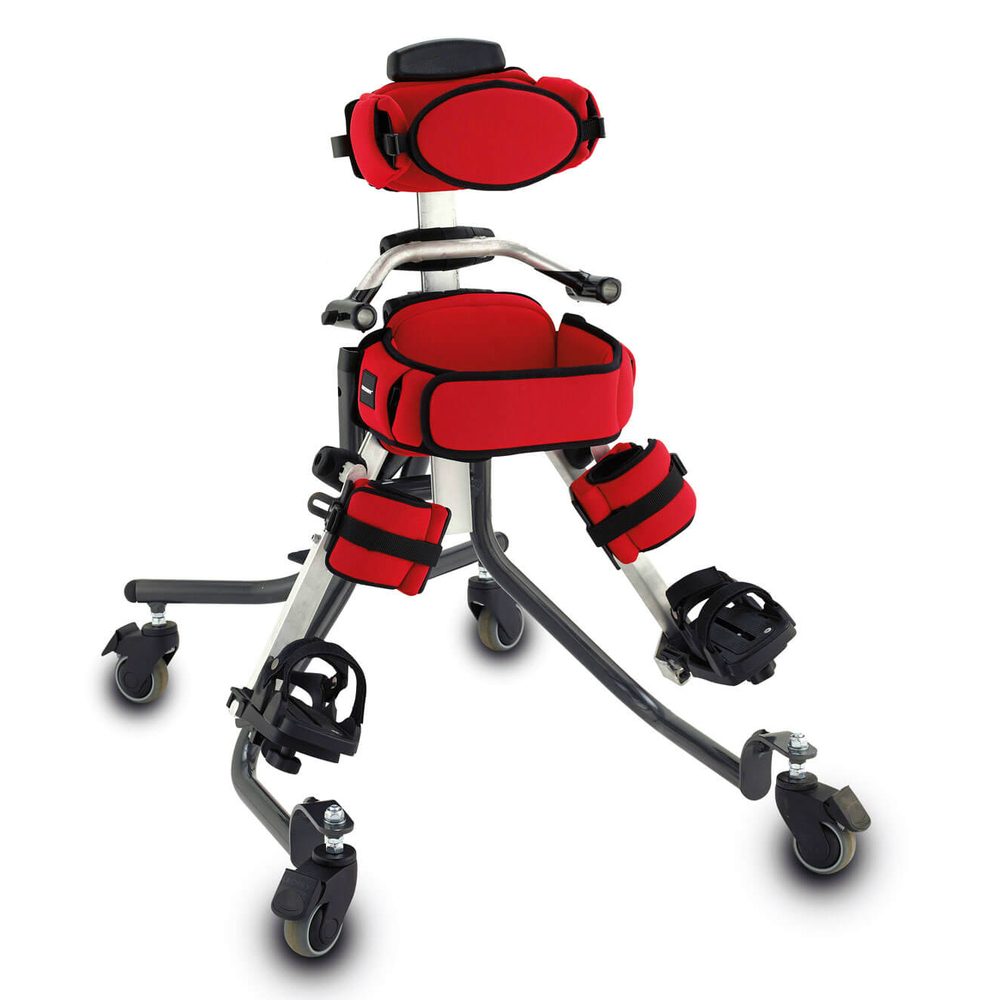 Мягкие коленные опоры могут быть индивидуально отрегулированы по высоте, углу, вращению и глубине для стояния в положении лежа на спине. Мягкая опора в области таза и груди также регулируется, чтобы обеспечить комфорт, безопасность и позволить вертикализатору расти вместе с ребенком.