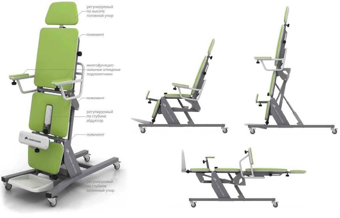 Стул-вертикализатор Universal СН-38.06 предназначен для использования ДЦП-больными и инвалидами, потерявшими двигательные функции, для тренировок и реабилитационных занятий. Он может применяться как оснащение стационаров и поликлиник или дома для самостоятельных занятий. С помощью вертикализатора обеспечивается постепенное переведение пациента из лежачего положения в наклонное и вертикальное, а также его посадка.